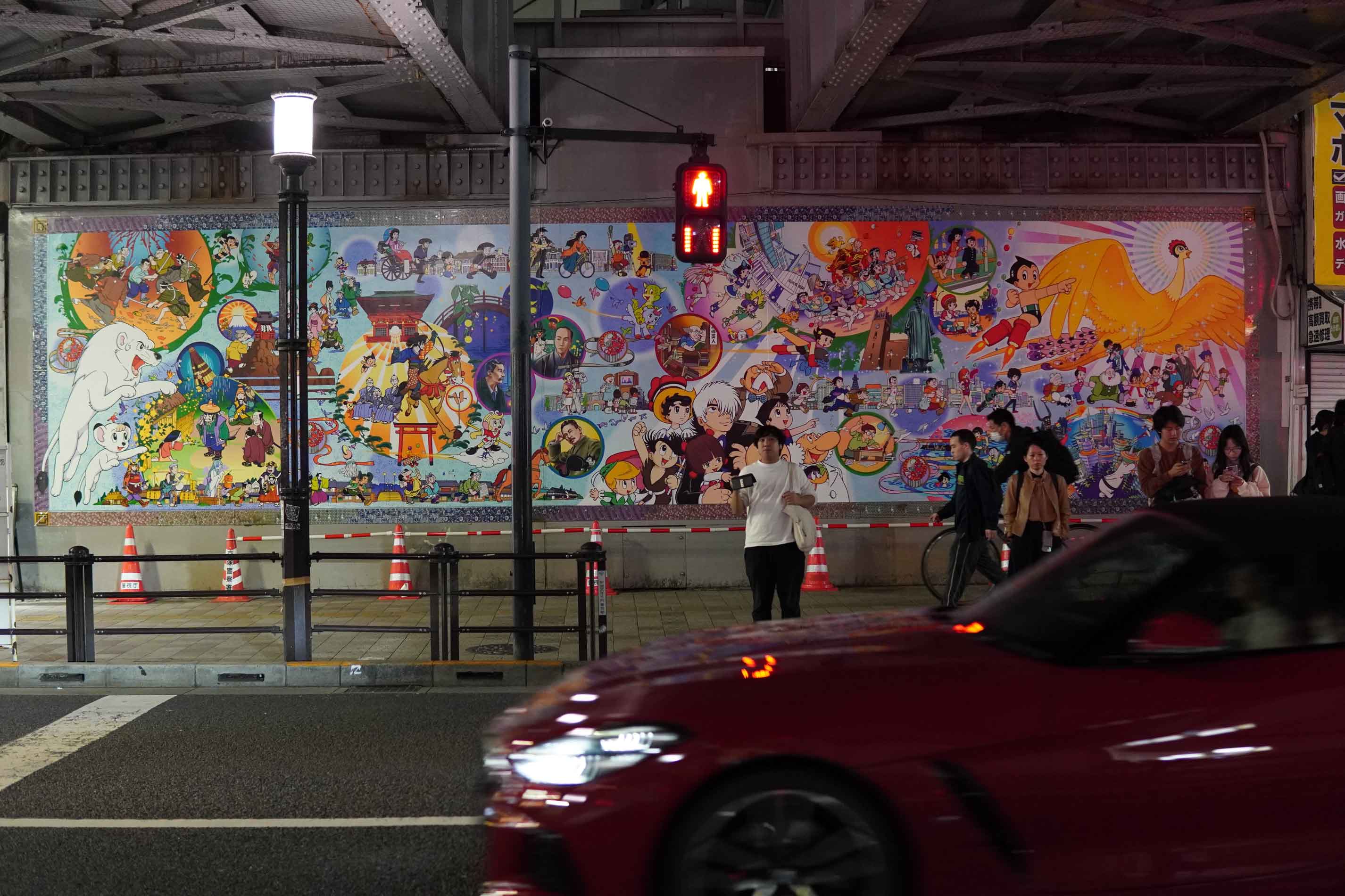 あっ、鉄腕アトムがいる。何でここにいるんだろう?まあ、ここで生まれたからだよ!そうです!世界的な漫画家、手塚治虫様がこの高田馬場で鉄腕アトムを生み出したのだ!手塚治虫様は大阪で生まれだけど、ほぼ一生を高田馬場で過ごしたんだ。だから、手塚様が亡くなったとき、生涯を記念する壁画が作られた。この壁画には、彼の他の作品も祀られている。